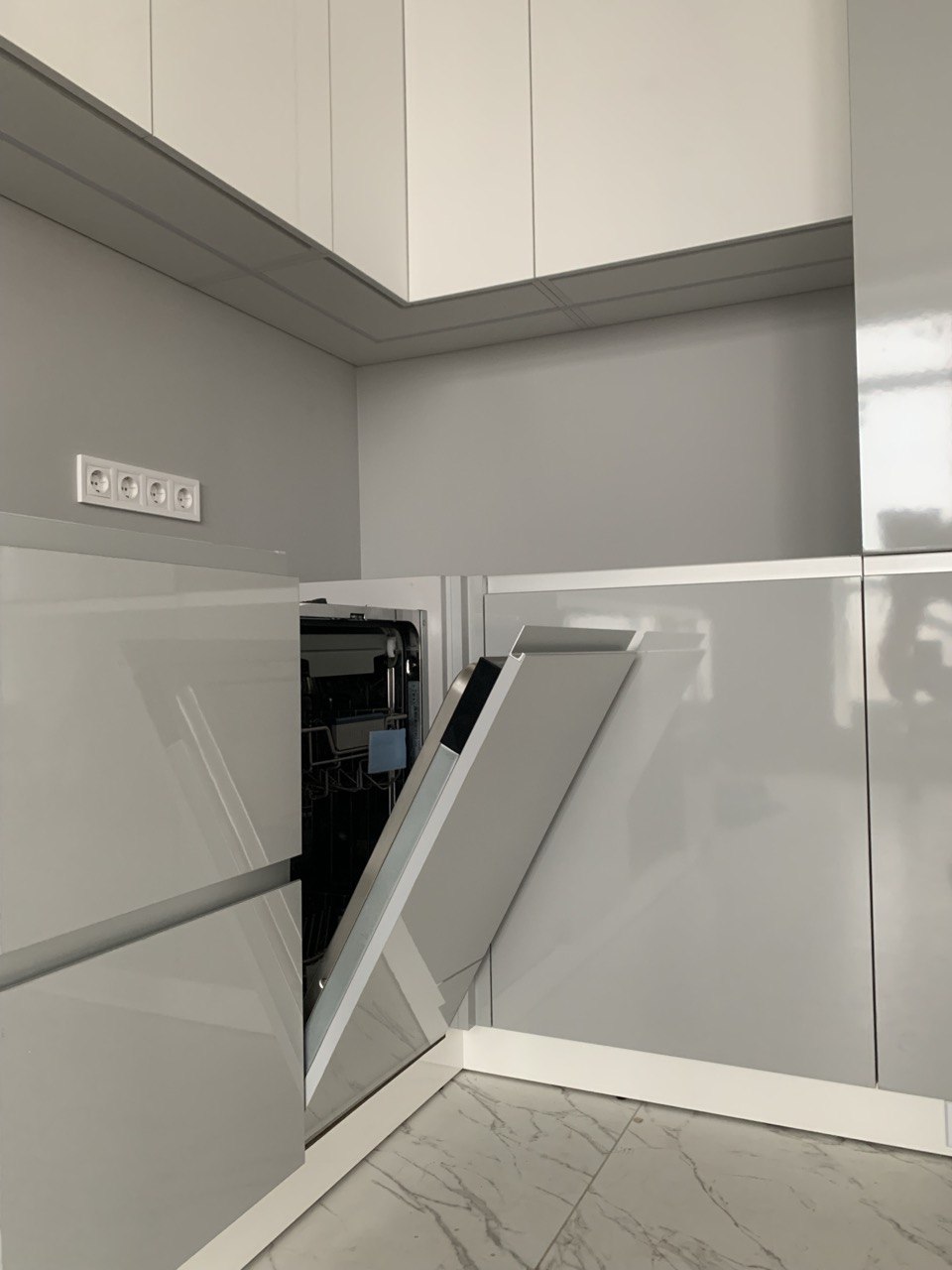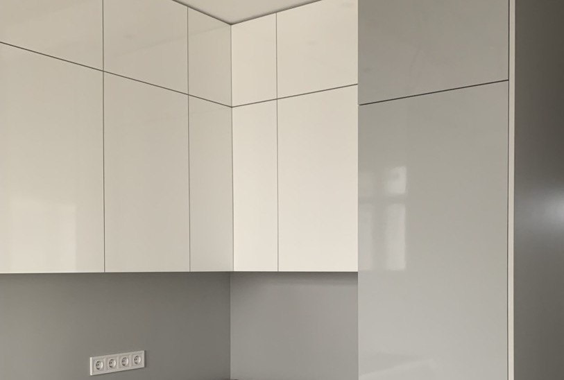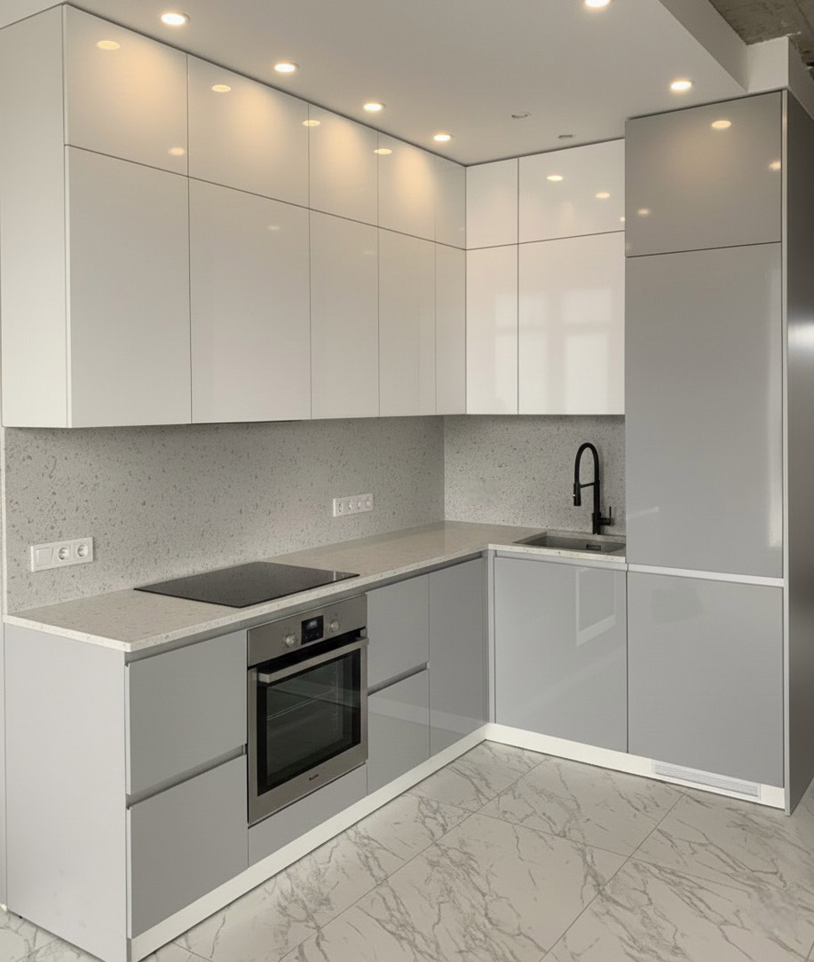 Кухня виконана у форматі «під стелю», завдяки чому модулі виглядають як цільна вертикальна площина та дають максимум місця для зберігання. Фасади — двоколірні: верхній ряд виконаний з білого глянцевого МДФ, нижній та колона — у світло-сірому тоні. Чисті лінії та відсутність декору підкреслюють сучасний характер проєкту.