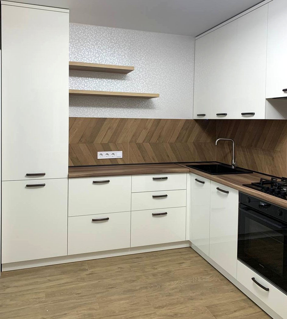Для цього проєкту ми створили кутову кухню з дерев’яним фартухом, зберігши баланс між функціональністю та легкою візуальною подачею. Замовник прагнув отримати кухню у світлих тонах, яка не захаращує простір і залишається практичною для щоденного використання.