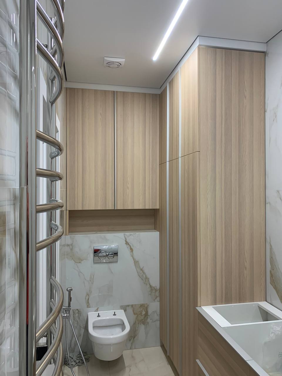 Також ви можете додатково оформити шафу на замовлення в єдиному стилі, щоб об’єднати дизайн ванної кімнати з іншими зонами — передпокоєм, гардеробною, пральнею.