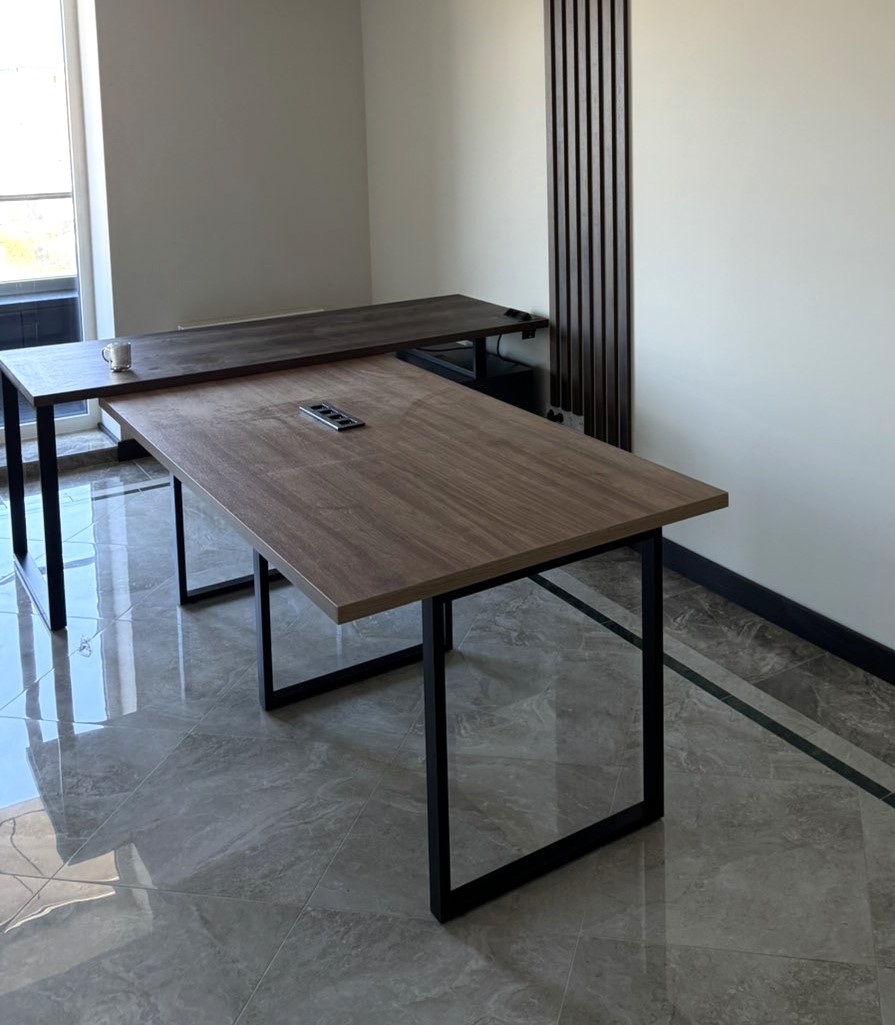 Основой конструкции стали прочные металлические опоры в матовом черном цвете. Они обеспечивают устойчивость и создают ощущение визуальной легкости. Деревянные столешницы подобраны в теплой натуральной текстуре — это делает офис более уютным и гармоничным.